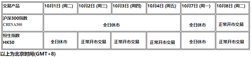 由于中国国庆节和重阳节假休市影响,以下中国大陆沪深交易所及中国香港交易HKEX股指产品的交易时间将受假期影响休市,敬请阁下留意知悉!