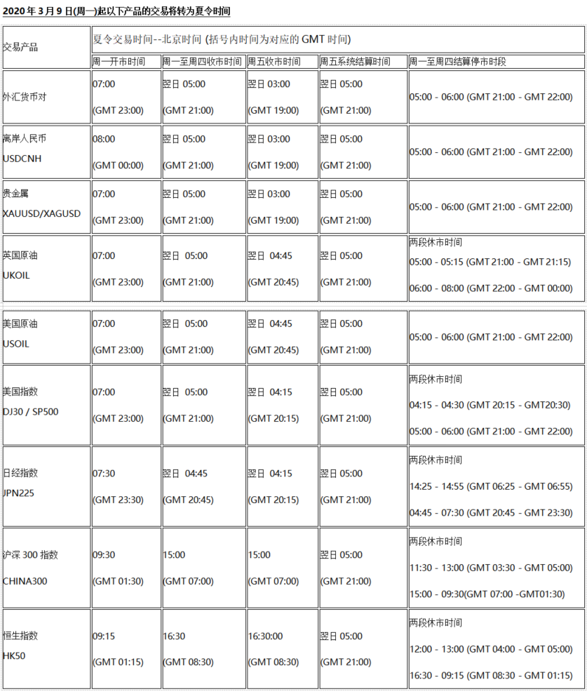因应北美时区202038(周日)以及欧洲时区2020329(周日)分别开始转为夏令时间, 欧美市场各产品的交易将调整为夏令时交易时间,敬请留意!