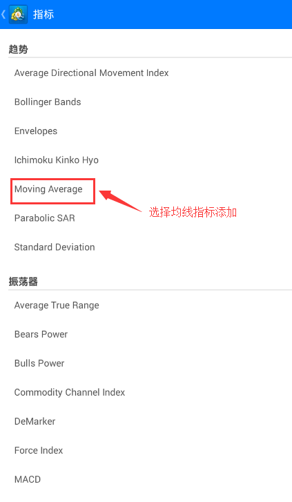 7.选择Moving Average均线指标进行添加